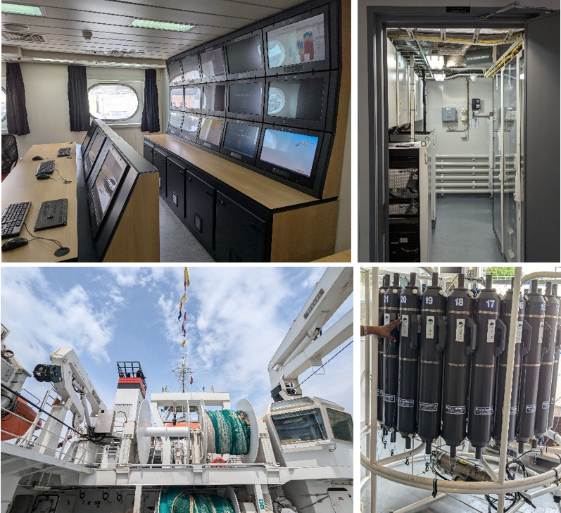 Le scientifique en charge de la visite explique que les communautés benthiques et démersales sont échantillonnées à l’aide de filets déployés depuis le pont, puis les organismes capturés sont identifiés, comptés et analysés dans le cadre du suivi des stocks halieutiques. L’objectif futur est de valoriser les spécimens récoltés en les transformant en produits alimentaires destinés à la consommation humaine. Le navire est également en charge des missions de sauvetage.