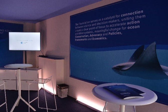 Stand de la Blue Azul Foundation: vitrine d’un financeur où des vidéos sur la préservation et la conservation de l’océan passent en boucle