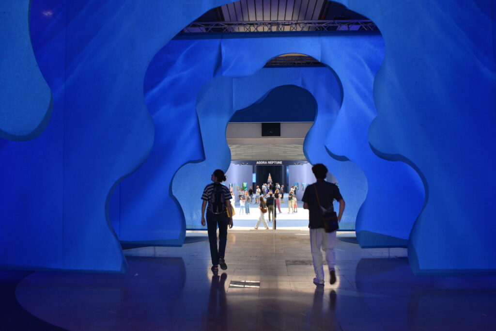 Un peu plus loin, en haut de quelques marches, une vaste galerie s’ouvre. Son plafond voûté évoque le ventre arrondi d’une baleine[1]. En contrebas, à nos pieds, le plan reproduit au sol indique que nous sommes dans la zone « d’embarquement ». Nous relevons d’autres termes poétiques, inspirés de l’environnement océanique ou des modes d’interactions humains pour l’approcher : « la vague », « immersion », « plongée libre ». À leurs côtés, plus pragmatique, l’espace « lounges partenaires » affiche la Fondation Oceano Azul, la Fondation Minderoo, Axa, BNP Paribas, Salesforce et la CMA-CGM, entreprise française de transport maritime en conteneurs détenue depuis 2024 par Bolloré Logistics et Altice Média, et principal soutien financier de l’organisation de l’UNOC à Nice.