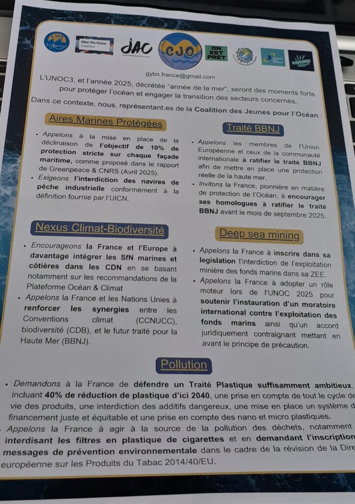 ii Deux exemples de manifestes écrits par des jeunes, comprenant des propositions sur la gouvernance de l’océan : manifeste de Jeunes engagés pour l’Océan et de la Coalition des Jeunes pour l’Océan, distribués le 12 juin 2025